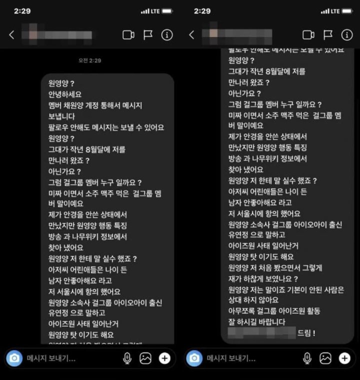 Alih-alih disampaikan langsung kepada Jang Won Young, pesan tersebut dikirim lewat DM kepada salah satu fanbase populer. Isi pesan tersebut membuat para penggemar merasa ngeri.